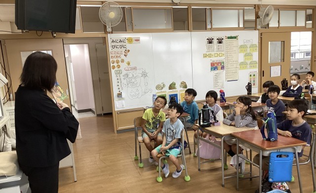 図書ボランティアの方に、読み聞かせをしていただきました。しかけ絵本など、楽しいお話もあり、お話の世界を楽しめたよい時間になりました。