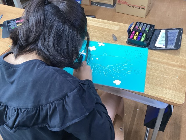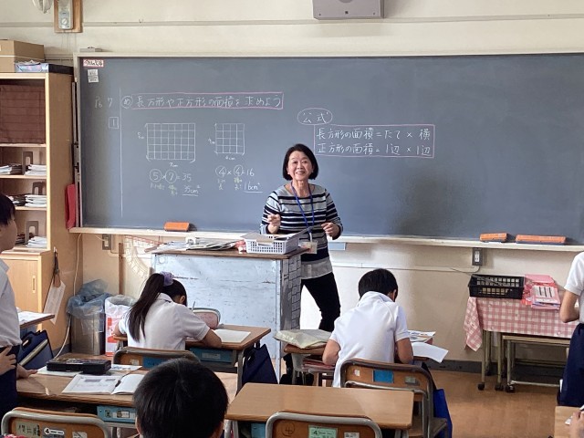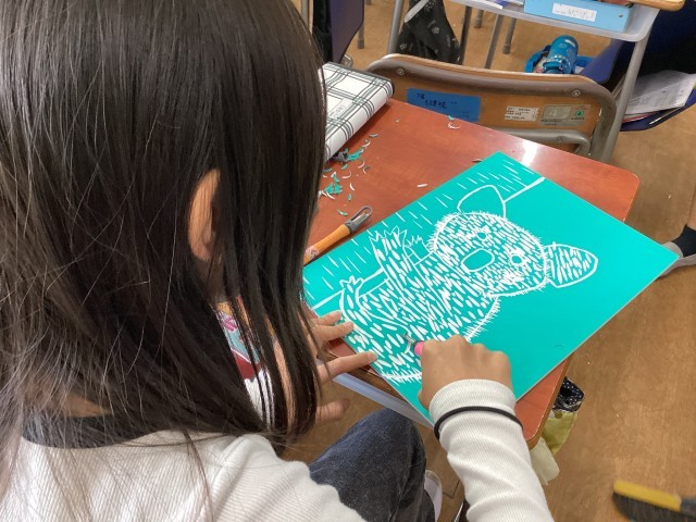 どのクラスも、彫刻刀を使い、頑張っています。算数では、長方形や正方形の公式を習い、それを使って問題を解いています。