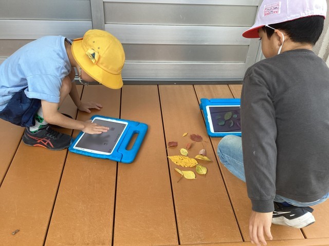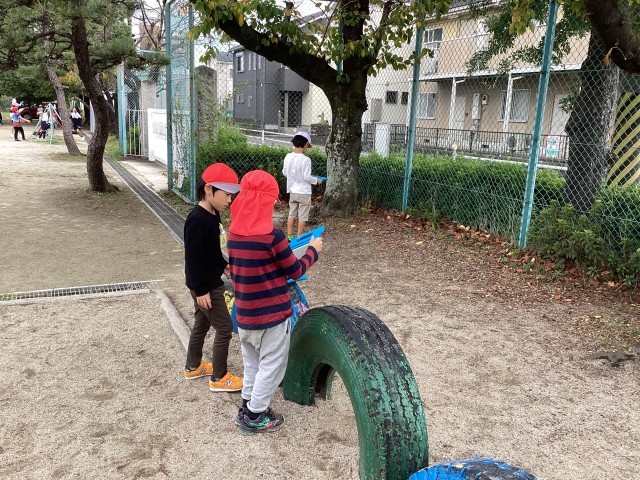 生活科の時間に、秋見つけに行きました。寒くなってきて、校庭の木の葉も少しずつ色づきはじめています。