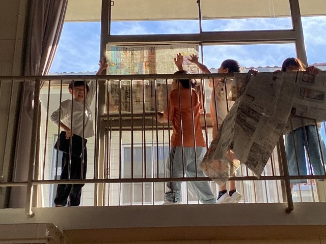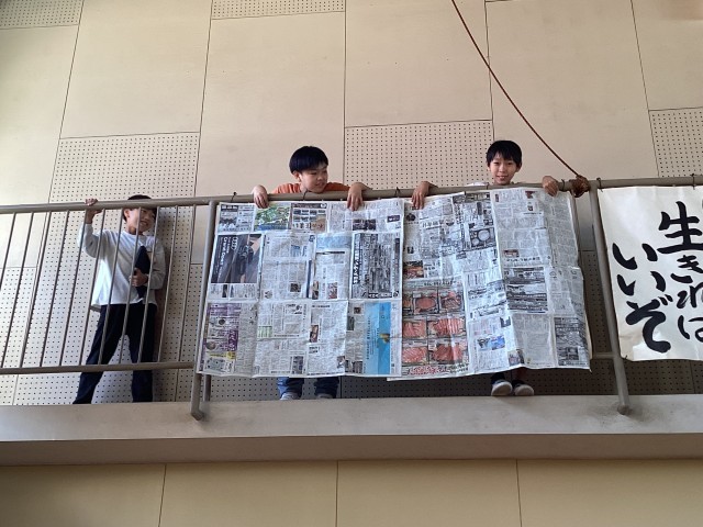 1組では、一足先に、前回作った1m2の新聞紙を使い、学校を探検しました。