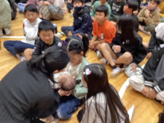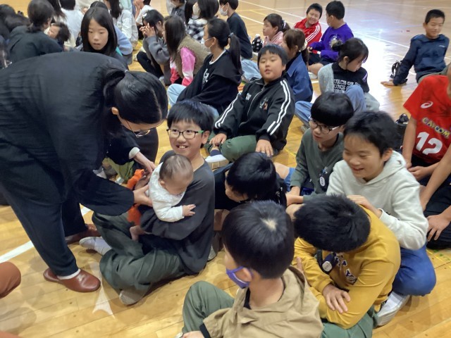 妊婦さんや赤ちゃんにも来ていただき、心拍音を聞かせてもらったり、だっこさせてもらったりしました。貴重な体験ありがとうございました。体験した5年生はとても優しい表情をしていました。