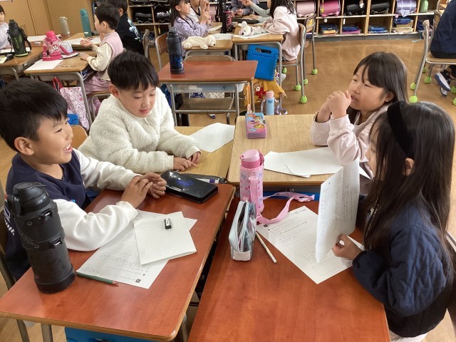 友達と話をつなげられるように、話し合いの進め方や話し合うときに大事なことについて学んでいます。相談の話し合いの様子です。友達の発言のよいところを認めたり、自分の考えを話したり、話し合いのポイントを意識していました。
