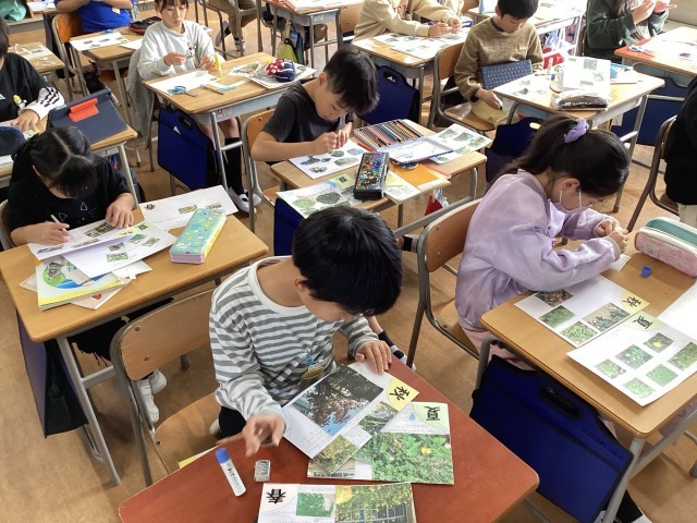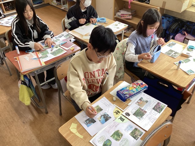 理科の授業で、秋の様子をまとめています。春や夏と比べなから、季節による変化をたくさんみつけています。