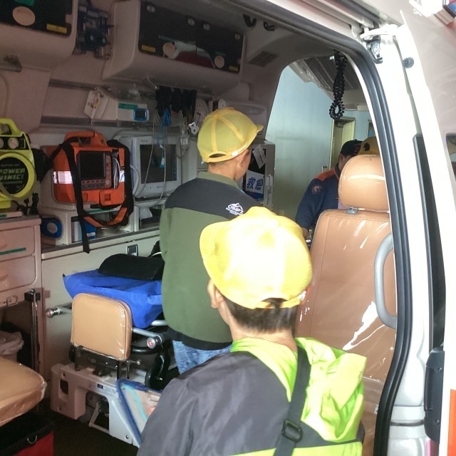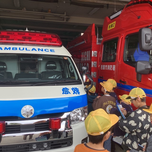 救急車の中に入らせていただいたり、いろいろな消防車両を見せて頂いたりしました。