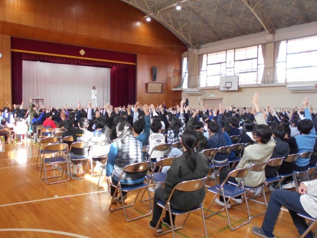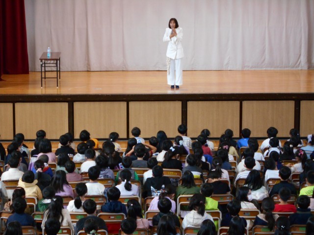 今日は、歌手の玉城ちはるさんに、周りの人を大切にすること、そして自分自身を大切にすることについてお話していただきました。玉城さんの面白いトークとすてきな歌を聞き、みんな笑顔いっぱいの時間をすごしました。「ありがとう、ごめんね、大好き」の言葉をいつも心に留めておきたいですね。