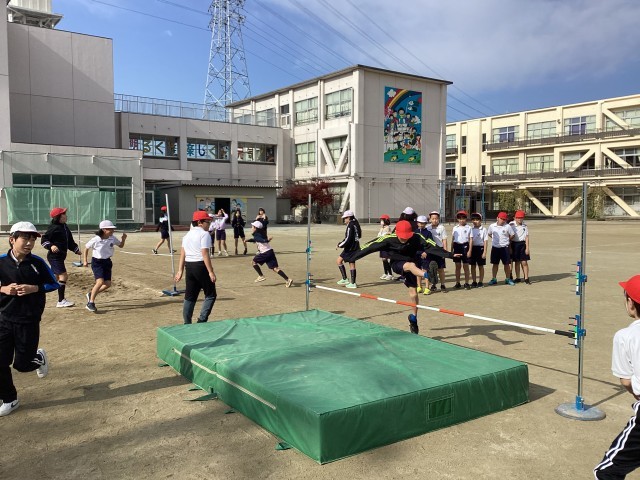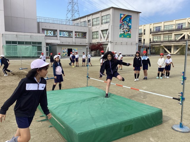 走り高跳びが始まりました。右左どちらの足が跳びやすいか考えながら跳びました。