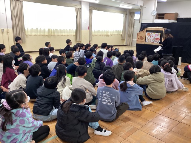 昼休みに大型紙芝居がありました。楽しみながら紙芝居を見ていました。