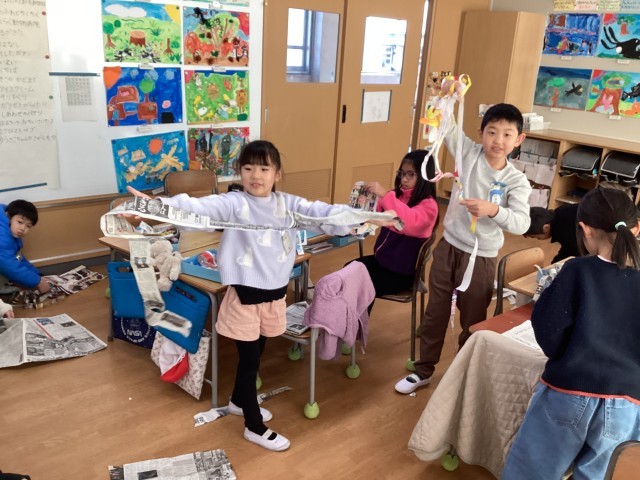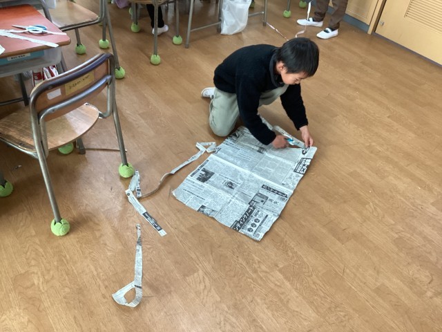 広告や新聞を細長く切りました。来週、細長い紙をつないだりつるしたりして、どんなものができるのか楽しみです。