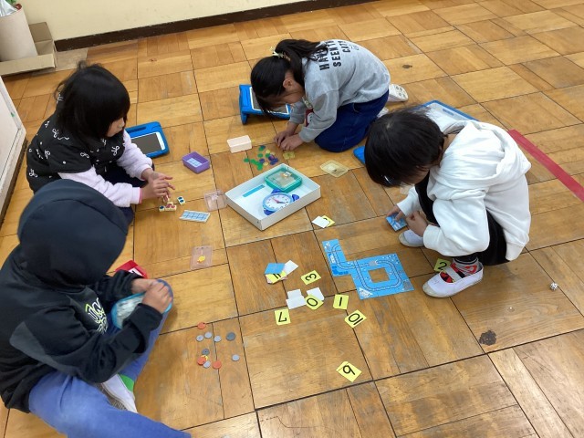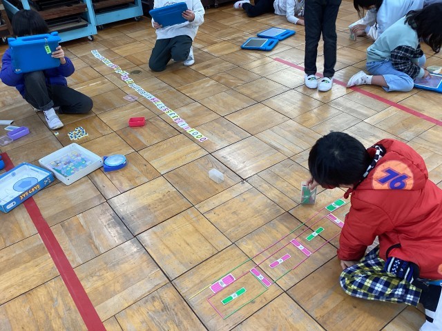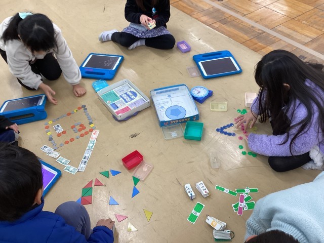図画工作科「ならべてならべて」の作品作りです。材料から、並べ方を考えて表現しています。