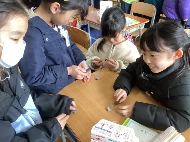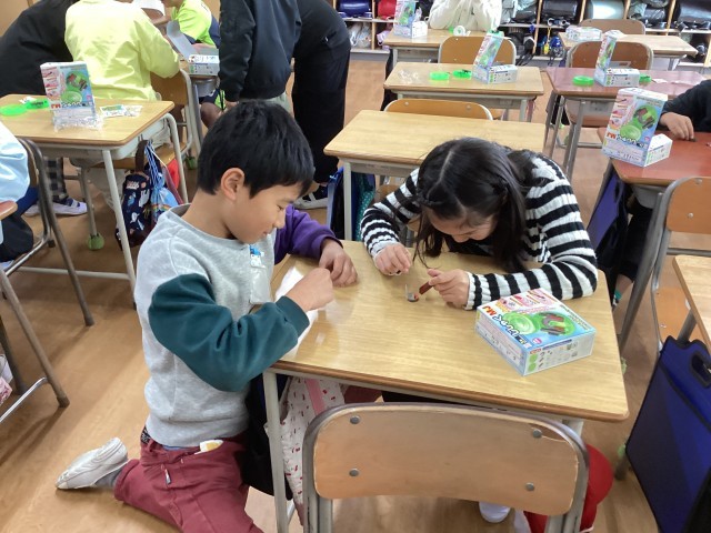 理科では磁石の勉強をしています。磁石を性質を使っておもちゃを作り、遊んでいる様子です。