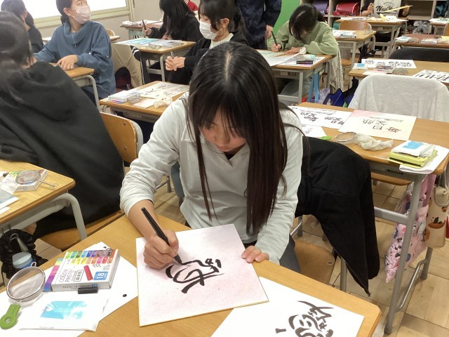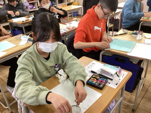 パステルで色紙の色付けを行い、自分が元気の出る言葉を自由に書いていました。