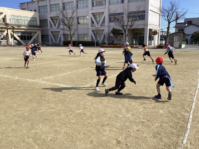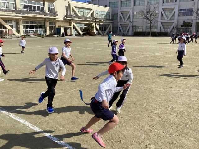 合同体育では、しっぽとり鬼ごっこをしました。思い切り走って、鬼ごっこの醍醐味を味わいました。