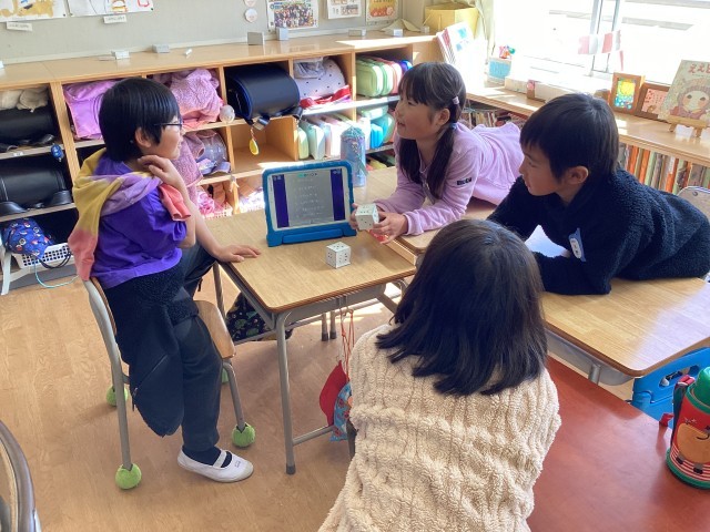 工作用紙で作ったはこの形で、サイコロを作りました。給食の時間の後、サイコロトークを楽しみました。