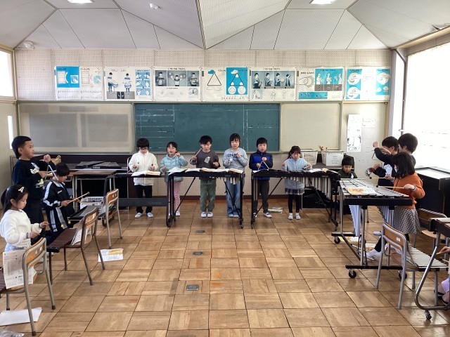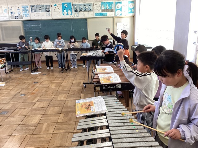 「おかしな時計」の合奏を楽しみました。楽器を交換して、それぞれのパートの音の響きを味わいました。