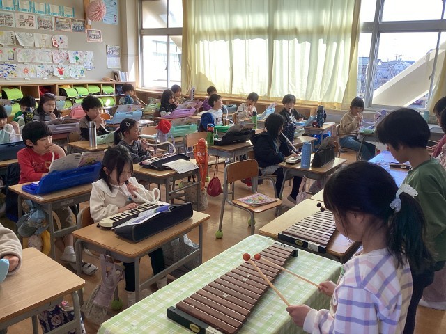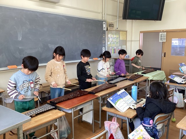音楽科の授業です。鍵盤ハーモニカ、木琴で「きらきらぼし」の演奏を楽しみました。