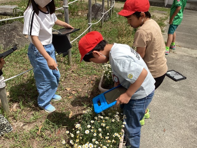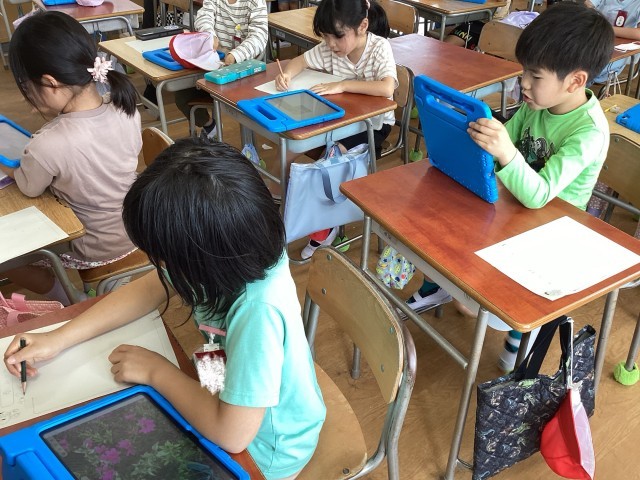 生活科の授業です。タブレットで、見つけた春の写真を撮りました。写真を見ながら、ワークシートに絵や気づきを記録しました。