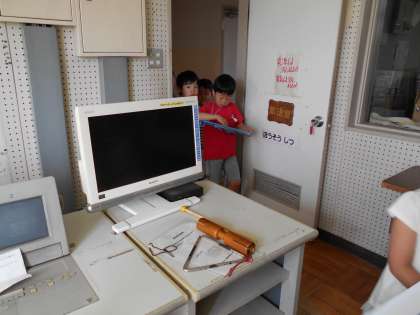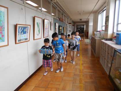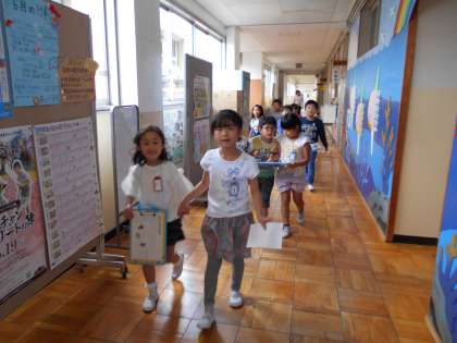 2年生ペアのお兄さん・お姉さんと一緒に学校探検をしました。学校にはいろいろな教室があることが分かりました。今度は自分たちで、探検します。楽しみですね。