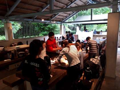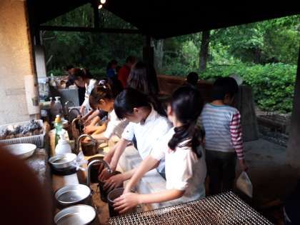 野外炊飯が始まりました。お米をといでご飯をたく係、野菜を切ってカレーを作る係、魚に塩をしてホイル焼きにする係、かまどに火をおこす係など、役割にそってがんばっています。