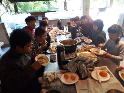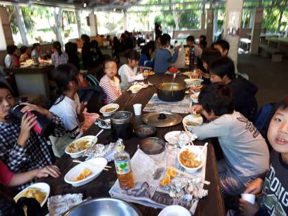 ご飯がたけ、カレーもでき、魚も焼けて、みんなで「いただきます!」