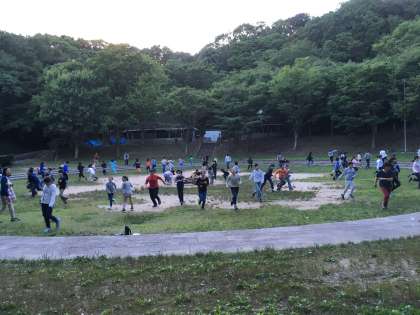 キャンプファイヤーの始まりです。火の神様に感謝を捧げて火を借ります。