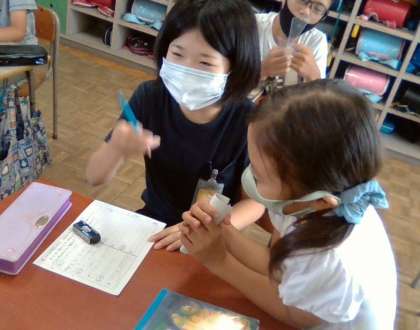 「どちらを選びますか」の学習です。今からペットを飼おうとする人にお勧めするなら…?2つのチームに分かれて、自分たちの立場や考えを明確にして討論していきます。今日は同じチームの友達と相談をしました。
