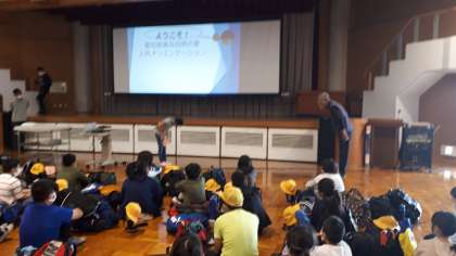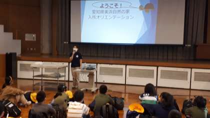 予定どおり美浜自然の家に到着しました。講堂に入って、入所式です。