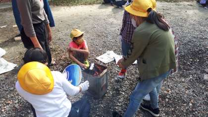 火起こしができたら、その火を使って焼きマシュマロを楽しみました。初めての火起こしは、とても苦労したけど、楽しかったようです。