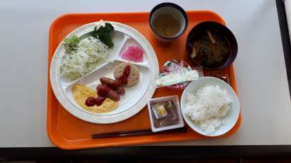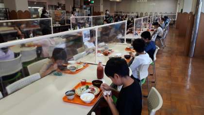 班ごとに間隔をあげて座ります。パーテーションもあり、安心して食事ができます。おかずの他に納豆と海苔もついています。