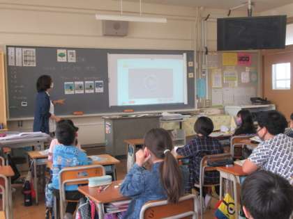 英語での天気の言い方や遊びの言い方を学びました。先生のあとに続いてくり返し発音しました。
