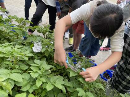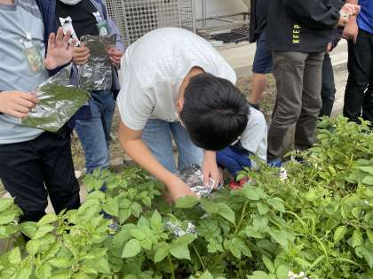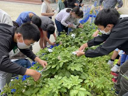 じゃがいもの葉を使って、日光と植物の関係について調べています。