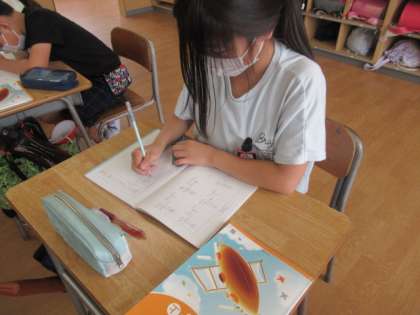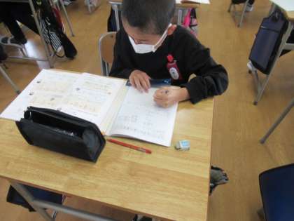1けたでわるわり算の筆算をしました。たてる→かける→ひく→おろす の順に気をつけて計算しました。