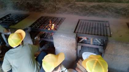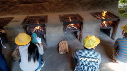火起こしで作った火を使って野外炊事です。かまど係がかまどの火をつけています。
