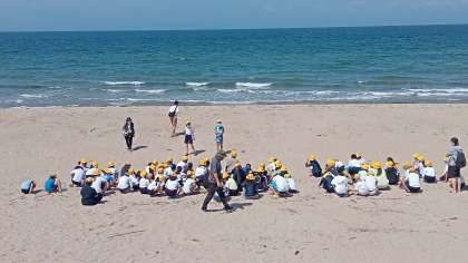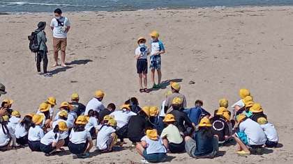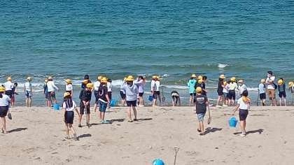 海まで歩いて10分、班ごとに砂の造形です。海の水も使いながら形作っていきます