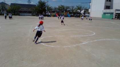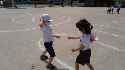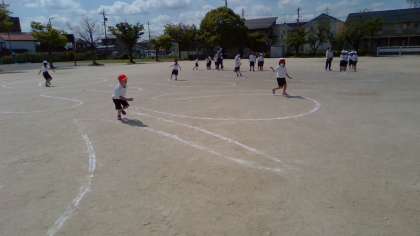 グループ対抗かけっこじゃんけんをしました。いろいろなコースで、楽しく走りました。