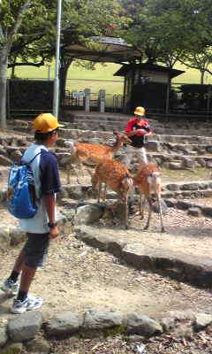 10:50 若草山で鹿と戯れる様子です。今のところ,鹿とはうまくお付き合いできているようですね。