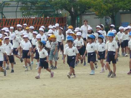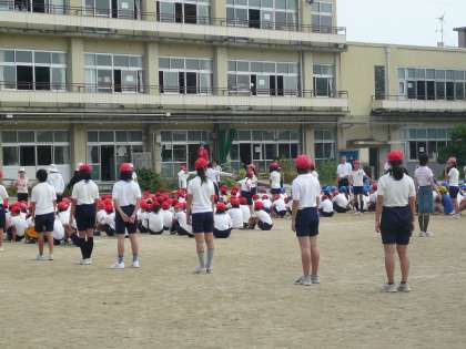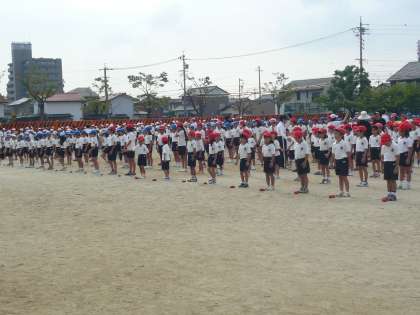 朝の全校集会の時間に,運動会に向けての全校練習を行いました。