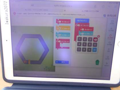 タイムシフトカメラと算数のプログラミングを教えていただきました。タイムシフトカメラでは自分の動きを撮影し、8秒後に再生される自分の映像を確かめていました。
