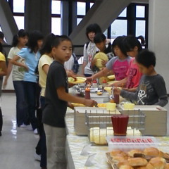 バイキング形式の朝食、みんなもりもり食べています。