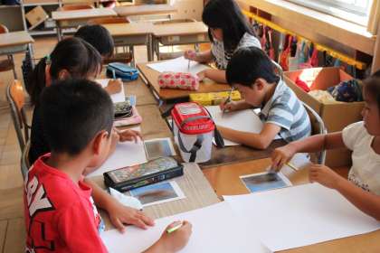 昨日釣ってきたザリガニをじっくり見つめて、大きな画用紙いっぱいに絵で表しました。