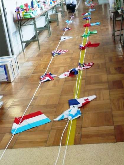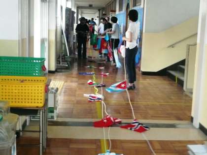 運動会を目前にした今日、授業後に先生たちで、この万国旗が使えるようにロープを伸ばして旗をつける作業を行いました。運動会当日、きれいな旗がはためきますよ〜!