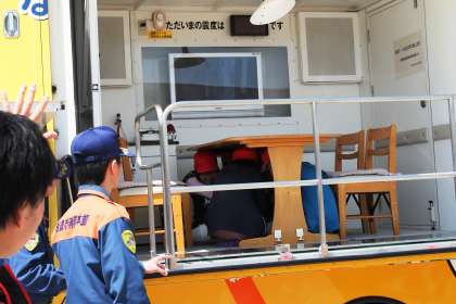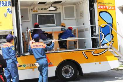 消火訓練の後、6年生は起震車「なまず号」を使っての地震体験を行いました。