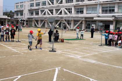 1・2年生は、運動場に道路や横断歩道を設置し、信号を立てたコースを使って、交差点の通行の仕方や道路の横断の仕方について教えてもらいました。
