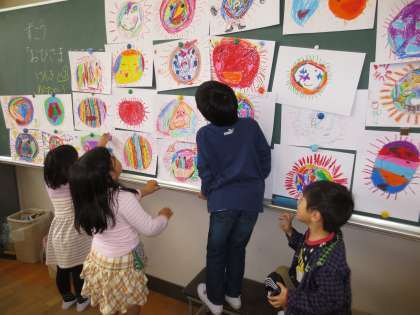 描き終わった後は、友達の作品を鑑賞しました。友達の作品を見て「かわいいね」「口が大きいね」と教室には、にこにこ笑顔がいっぱいになりました。
