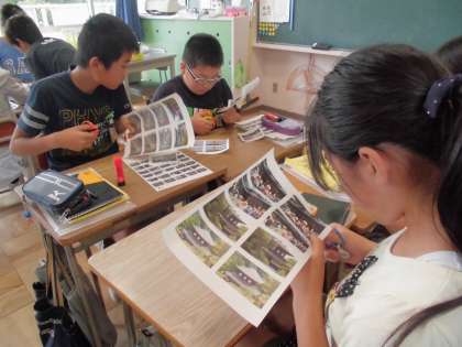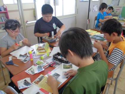 修学旅行で撮影した写真を切り貼りして旅行記に貼りました。写真を見ると修学旅行の思い出がよみがえってきます。学んだことやその場面のエピソードも書き添え、旅行記がどんどんできあがっていきます。