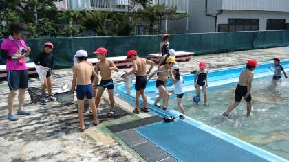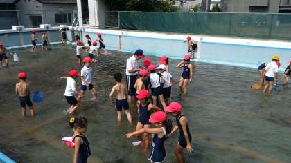 プール掃除の前に、ヤゴ取りに挑戦しました。アメンボはたくさん見つかるようですが、・・・。