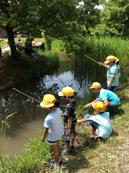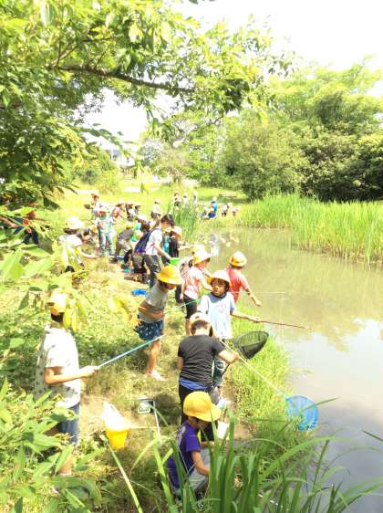 2年生は岩倉市自然生態園へざりがにつりに来ました。みんな必死です。もう釣れた子は笑顔いっぱいです。