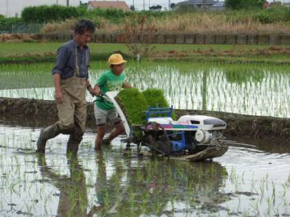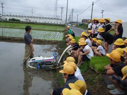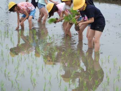 6/9(火)に総合学習の講師服部先生の指導により,田んぼで田植えの体験をさせていただきました。子どもたちは,田んぼの泥の感触に驚いているようでした。