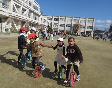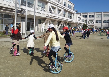 2・4年生が一緒に一輪車を遊んでいました。写真では伝えきれませんでしたが、上手なメリーゴーランドができていました。楽しそうな笑顔ですね。微笑ましい光景でした。