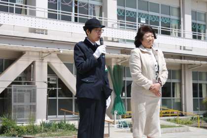 昨日の一斉下校の時に新しい交通指導員さんの紹介がありました。本年度から井上さよさんに代わりました。