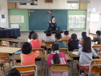 2年生になり、週に1時間、音楽室にて白鳥先生による音楽の授業が始まりました。緊張しながらも、きれいな歌声が広がっていました。